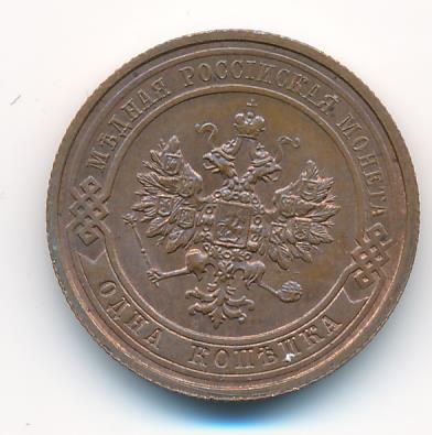 Лицевая сторона — двуглавый орел, надпись МЕДНАЯ РОССIЙСКАЯ МОНЕТА и обозначение номинала (одна копейка); оборотная — обозначение номинала (1 копейка) в бусовом ободке и дата. Нормативный вес — 3,28 грамма, гурт рубчатый.