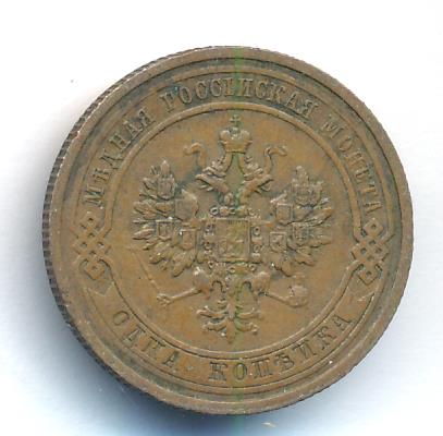 Лицевая сторона — двуглавый орел, надпись МЕДНАЯ РОССIЙСКАЯ МОНЕТА и обозначение номинала (одна копейка); оборотная — обозначение номинала (1 копейка) в бусовом ободке и дата. Нормативный вес — 3,28 грамма, гурт рубчатый.