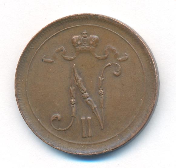 Лицевая сторона — вензель Александра II, оборотная — номинал (10 PENNIA) в венке из дубовых ветвей и дата. Нормативный вес — 12,80 грамма, гурт гладкий.