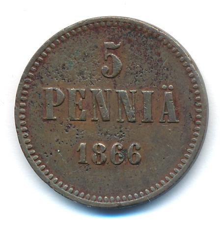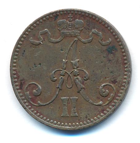 Лицевая сторона — вензель Александра II, оборотная — номинал (5 PENNIA) и дата. Нормативный вес — 6,40 грамма, гурт гладкий.