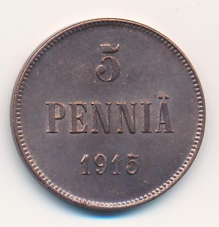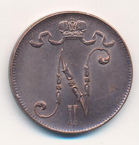 Лицевая сторона — вензель Александра II, оборотная — номинал (5 PENNIA) и дата. Нормативный вес — 6,40 грамма, гурт гладкий.