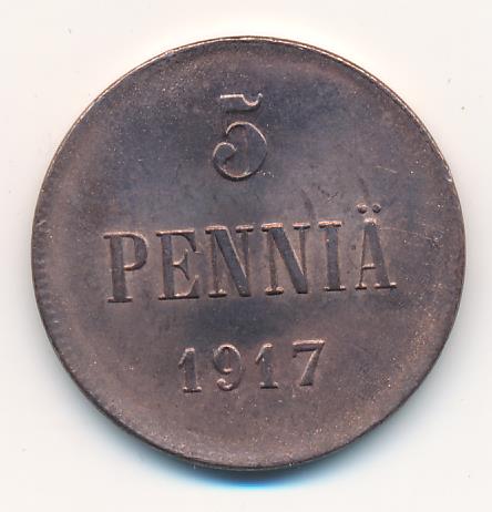 Лицевая сторона — вензель Александра II, оборотная — номинал (5 PENNIA) и дата. Нормативный вес — 6,40 грамма, гурт гладкий.