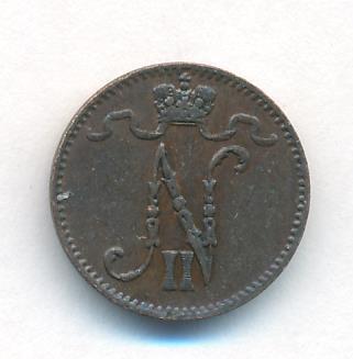 Лицевая сторона — вензель Александра II, оборотная — номинал (1 PENNIA) и дата. Нормативный вес — 1,28 грамма, гурт гладкий.
