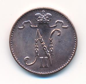 Лицевая сторона — вензель Александра II, оборотная — номинал (1 PENNIA) и дата. Нормативный вес — 1,28 грамма, гурт гладкий.