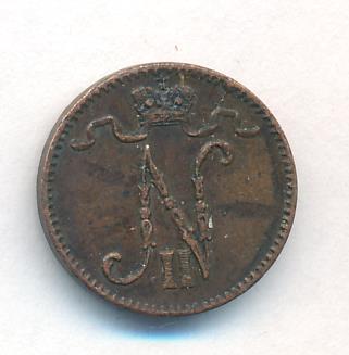 Лицевая сторона — вензель Александра II, оборотная — номинал (1 PENNIA) и дата. Нормативный вес — 1,28 грамма, гурт гладкий.