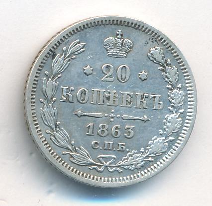 Лицевая сторона — гербовый орел, оборотная —обозначение номинала (20 копеекъ), окруженное венком из лавровой и дубовой ветвей и дата.