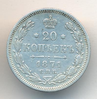 Лицевая сторона — гербовый орел, оборотная —обозначение номинала (20 копеекъ), окруженное венком из лавровой и дубовой ветвей и дата.