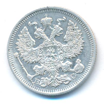 Лицевая сторона — гербовый орел, оборотная —обозначение номинала (20 копеекъ), окруженное венком из лавровой и дубовой ветвей и дата.