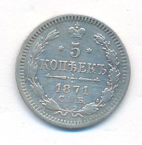 Лицевая сторона — гербовый орел, оборотная —обозначение номинала (5 копеекъ), окруженное венком из лавровой и дубовой ветвей и дата.