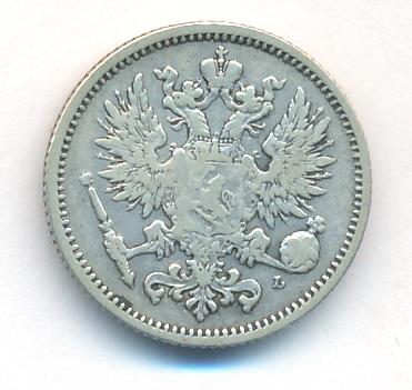 Лицевая сторона — российский двуглавый орел с гербом Великого княжества Финляндского на груди, оборотная — номинал и дата в венке из дубовых листьев. Проба — 750, нормативный вес — 2,55 грамма, гурт рубчатый.