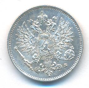 Лицевая сторона — российский двуглавый орел с гербом Великого княжества Финляндского на груди, оборотная — номинал и дата в венке из дубовых листьев. Проба — 750, нормативный вес — 1,27 грамма, гурт рубчатый.