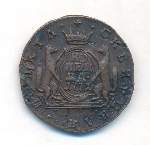 Лицевая сторона - два соболя поддерживают щит с обозначением номинала (копейка) под короной, надпись «СИБИРСКАЯ МОНЕТА». Оборотная — вензель Екатерины II в венке из пальмовой и лавровой ветвей. Гурт — шнур, вес — 6,55 грамма.