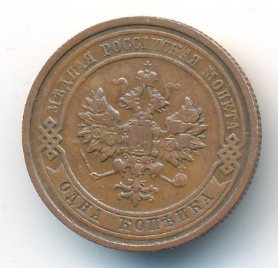Лицевая сторона — двуглавый орел, надпись МЕДНАЯ РОССIЙСКАЯ МОНЕТА и обозначение номинала (одна копейка); оборотная — обозначение номинала (1 копейка) в бусовом ободке и дата. Нормативный вес — 3,28 грамма, гурт рубчатый.
