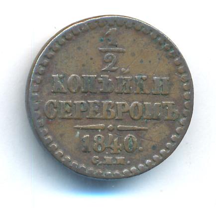 На новых монетах равенство серебряному курсу указано прямо в номинале: «1/2 КОПЕЙКИ СЕРЕБРОМ». Указ об их выпуске следует 6 сентября 1840 года («О новой медной монете на серебро 16-рублевого в пуде достоинства»). Массовая чеканка началось за год до этого на Екатеринбургском (знак ЕМ) и Сузунском (знак СМ) дворах. В качестве временной меры в 1840-1843 годах к ним подключается Ижорский завод (знак СПМ). С 1844 года после «значительного скопления медной монеты в народном обращении» в Екатеринбурге производство прекращается, а в Сузуне сокращается. Варшавский двор (знак MW), получив разрешение на выпуск общегосударственной монеты, успел отчеканить ее лишь в небольшом количестве в 1848 году.