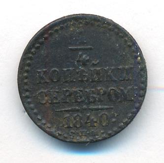 На новых монетах равенство серебряному курсу указано прямо в номинале: «1/4 КОПЕЙКИ СЕРЕБРОМ». Указ об их выпуске следует 6 сентября 1840 года («О новой медной монете на серебро 16-рублевого в пуде достоинства»). Массовая чеканка началось за год до этого на Екатеринбургском (знак ЕМ) и Сузунском (знак СМ) дворах. В качестве временной меры в 1840-1843 годах к ним подключается Ижорский завод (знак СПМ). С 1844 года после «значительного скопления медной монеты в народном обращении» в Екатеринбурге производство прекращается, а в Сузуне сокращается.