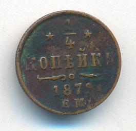 Лицевая сторона — вензель Александра II в венке из лавровой и дубовой ветвей; оборотная — обозначение номинала (1/4 копейки) и дата. Нормативный вес — 0,82 грамма, гурт рубчатый.