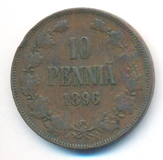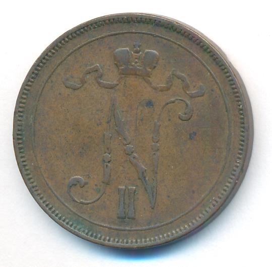 Лицевая сторона — вензель Александра II, оборотная — номинал (10 PENNIA) в венке из дубовых ветвей и дата. Нормативный вес — 12,80 грамма, гурт гладкий.