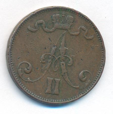 Лицевая сторона — вензель Александра II, оборотная — номинал (5 PENNIA) и дата. Нормативный вес — 6,40 грамма, гурт гладкий.