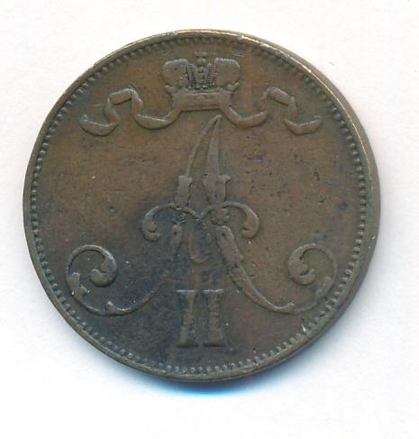 Лицевая сторона — вензель Александра II, оборотная — номинал (5 PENNIA) и дата. Нормативный вес — 6,40 грамма, гурт гладкий.