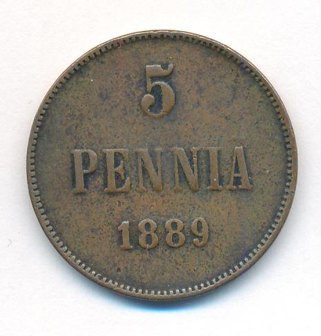 Лицевая сторона — вензель Александра II, оборотная — номинал (5 PENNIA) и дата. Нормативный вес — 6,40 грамма, гурт гладкий.