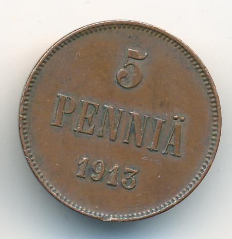 Лицевая сторона — вензель Александра II, оборотная — номинал (5 PENNIA) и дата. Нормативный вес — 6,40 грамма, гурт гладкий.