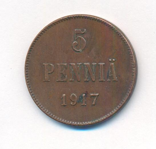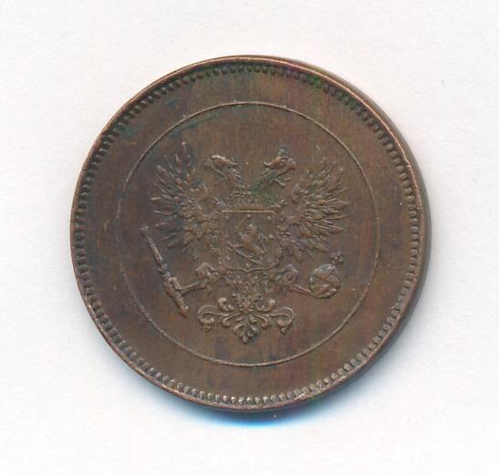 Лицевая сторона — вензель Александра II, оборотная — номинал (5 PENNIA) и дата. Нормативный вес — 6,40 грамма, гурт гладкий.