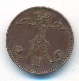 Лицевая сторона — вензель Александра II, оборотная — номинал (1 PENNIA) и дата. Нормативный вес — 1,28 грамма, гурт гладкий.