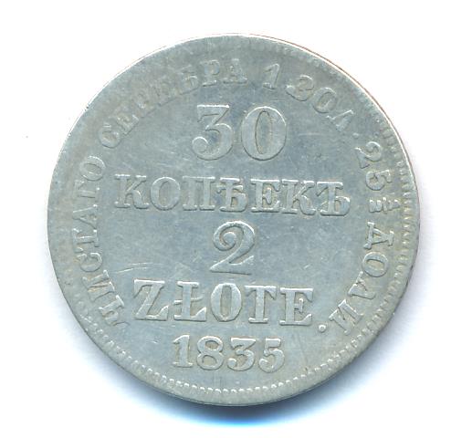 Указом от 15 октября 1832 года «для удобства торговых сношений» Николай I добавляет в ряд серебряных монет новый номинал — 15 копеек, соответствующий одному польскому злотому. Указом от 1 мая 1834 года вводятся 30 копеек/2 злотых и разрешается чеканка всех номиналов Варшавскому двору. Для организации штемпельного производства из Петербурга 19 июня того же года высылаются рисунки, четыре пары штемпелей и четыре образцовых монеты. Штемпели 30 копеек/2 злотых предоставляется сделать по посланному рисунку варшавским мастерам.