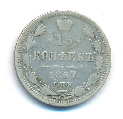 Лицевая сторона — гербовый орел, оборотная —обозначение номинала (15 копеекъ), окруженное венком из лавровой и дубовой ветвей и дата.
