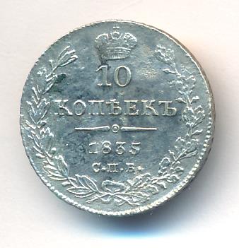 Лицевая сторона — новый гербовый орел с поднятыми крыльями, оборотная —обозначение номинала (10 копеекъ), окруженное венком из лавровой и дубовой ветвей и дата. Проба — 868, нормативный вес — 2,07 грамма.