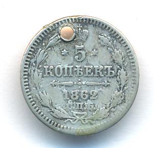 Лицевая сторона — гербовый орел, оборотная —обозначение номинала (5 копеекъ), окруженное венком из лавровой и дубовой ветвей и дата.