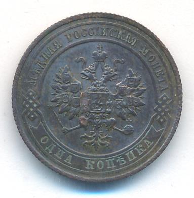 Лицевая сторона — двуглавый орел, надпись МЕДНАЯ РОССIЙСКАЯ МОНЕТА и обозначение номинала (одна копейка); оборотная — обозначение номинала (1 копейка) в бусовом ободке и дата. Нормативный вес — 3,28 грамма, гурт рубчатый.