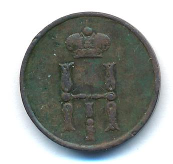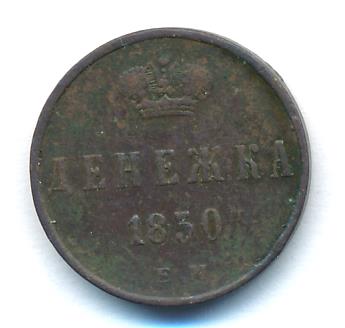 Лицевая сторона — вензель Николая I, оборотная — обозначение номинала (денежка) и дата. Нормативный вес — 2,56 грамма, гурт гладкий.