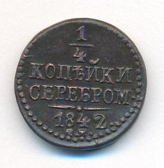 Лицевая сторона — вензель Николая I в бусовом ободке, оборотная — надпись «1/4 КОПЕЙКИ СЕРЕБРОМ» и дата. Нормативный вес — 2,56 грамма, гурт гладкий.