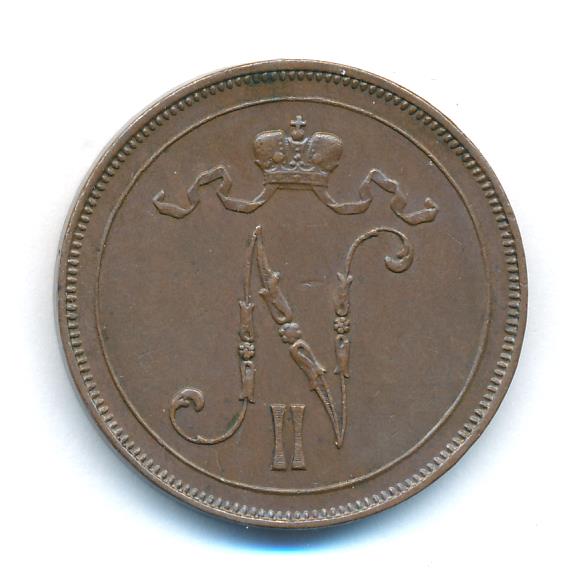 Лицевая сторона — вензель Александра II, оборотная — номинал (10 PENNIA) в венке из дубовых ветвей и дата. Нормативный вес — 12,80 грамма, гурт гладкий.