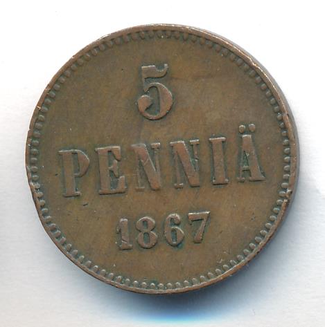 Лицевая сторона — вензель Александра II, оборотная — номинал (5 PENNIA) и дата. Нормативный вес — 6,40 грамма, гурт гладкий.