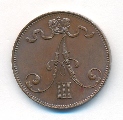 Лицевая сторона — вензель Александра II, оборотная — номинал (5 PENNIA) и дата. Нормативный вес — 6,40 грамма, гурт гладкий.