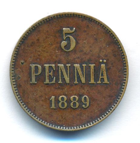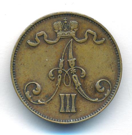 Лицевая сторона — вензель Александра II, оборотная — номинал (5 PENNIA) и дата. Нормативный вес — 6,40 грамма, гурт гладкий.