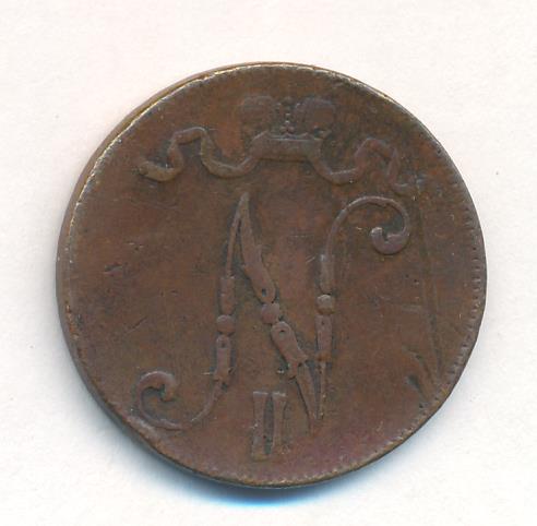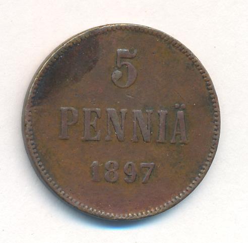 Лицевая сторона — вензель Александра II, оборотная — номинал (5 PENNIA) и дата. Нормативный вес — 6,40 грамма, гурт гладкий.