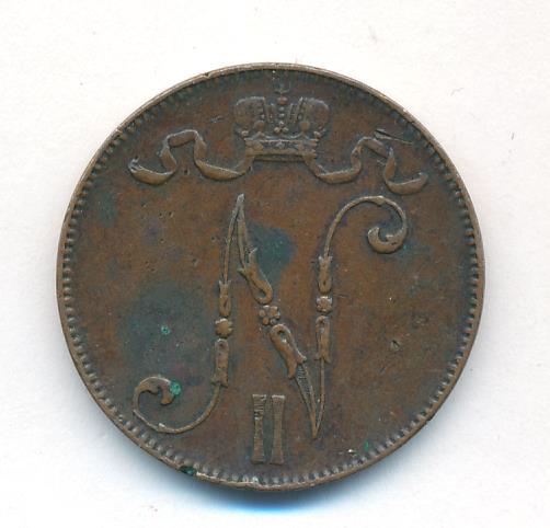 Лицевая сторона — вензель Александра II, оборотная — номинал (5 PENNIA) и дата. Нормативный вес — 6,40 грамма, гурт гладкий.