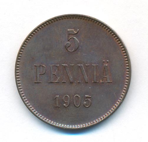 Лицевая сторона — вензель Александра II, оборотная — номинал (5 PENNIA) и дата. Нормативный вес — 6,40 грамма, гурт гладкий.