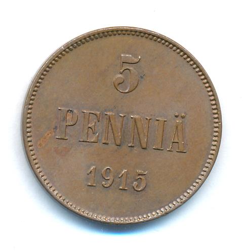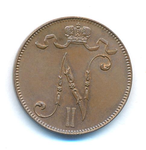 Лицевая сторона — вензель Александра II, оборотная — номинал (5 PENNIA) и дата. Нормативный вес — 6,40 грамма, гурт гладкий.