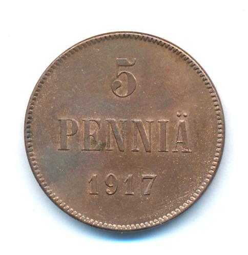 Лицевая сторона — вензель Александра II, оборотная — номинал (5 PENNIA) и дата. Нормативный вес — 6,40 грамма, гурт гладкий.