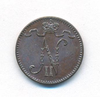 Лицевая сторона — вензель Александра II, оборотная — номинал (1 PENNIA) и дата. Нормативный вес — 1,28 грамма, гурт гладкий.