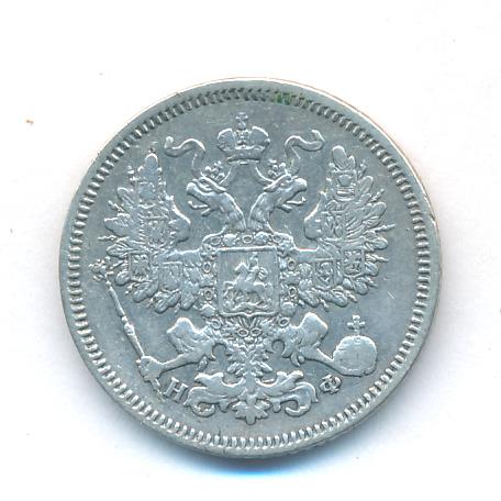 Лицевая сторона — гербовый орел, оборотная —обозначение номинала (20 копеекъ), окруженное венком из лавровой и дубовой ветвей и дата.