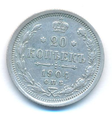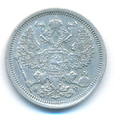 Лицевая сторона — гербовый орел, оборотная —обозначение номинала (20 копеекъ), окруженное венком из лавровой и дубовой ветвей и дата.