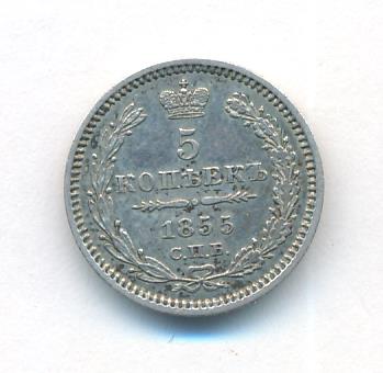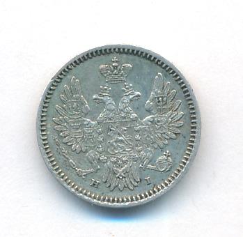 Лицевая сторона — новый гербовый орел с поднятыми крыльями, оборотная —обозначение номинала (5 копеекъ), окруженное венком из лавровой и дубовой ветвей и дата. Проба — 868, нормативный вес — 1,04 грамма.
