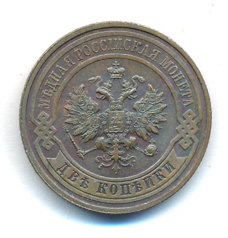 Лицевая сторона — двуглавый орел, надпись МЕДНАЯ РОССIЙСКАЯ МОНЕТА и обозначение номинала (две копейки); оборотная — обозначение номинала (2 копейки) в бусовом ободке и дата. Нормативный вес — 6,55 грамма, гурт рубчатый.