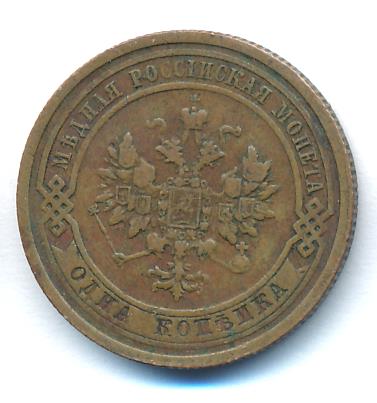Лицевая сторона — двуглавый орел, надпись МЕДНАЯ РОССIЙСКАЯ МОНЕТА и обозначение номинала (одна копейка); оборотная — обозначение номинала (1 копейка) в бусовом ободке и дата. Нормативный вес — 3,28 грамма, гурт рубчатый.