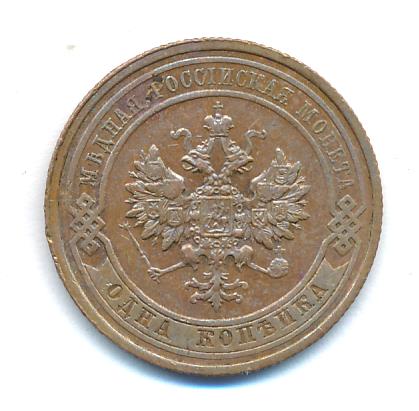 Лицевая сторона — двуглавый орел, надпись МЕДНАЯ РОССIЙСКАЯ МОНЕТА и обозначение номинала (одна копейка); оборотная — обозначение номинала (1 копейка) в бусовом ободке и дата. Нормативный вес — 3,28 грамма, гурт рубчатый.